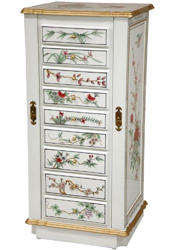Choose either our fine gold leaf lacquer or lovely white lacquer design, both hand painted with a lovely Ming dynasty era birds and flowers decorative art motif. These are fine, heirloom quality cabinets, sturdily crafted, and beautifully configured with lined drawers, side cabinets, and a mirrored top compartment. Lots of convenient storage space for a large jewelry or curio collection, as well as providing and exceptional oriental accent for the bedroom. Note we offer these same designs in black lacquer finishes, as well as slightly different configurations of elegant lacquered jewelry cabinets, boxes, and armoires. Ships next business day from your order, professionally packed, fully insured from our Massachussetts warehouse via Fed Ex, with expedited delivery available. Browse our entire selection of fine Chinese lacquer furniture and decor on Amazon.com.