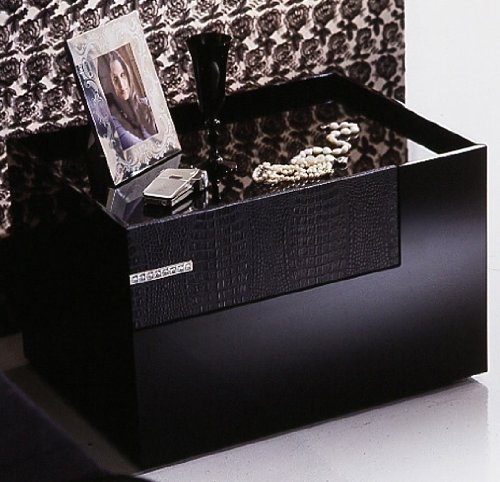 Designed for use on the right side of the bed, this solid wood nightstand with a sunken top for added architectural interest will be a sleek, sophisticated addition to your home's decor. It is enhanced by crocodile patterned bicast leather and Swarovski crystals, and is finished in a gleaming black lacquer. A coordinating left nightstand is sold separately. Diamond right nightstand is finished in black lacquer with leather and Swarovski crystal accents. One drawer. Swarovski Cyrstal embedded designHigh Gloss lacqueredCrocodile Leather effectMade from woodMinimal assembly required17.7 in. W x 23.6 in. L x 15.4 in. H (57 lbs.)