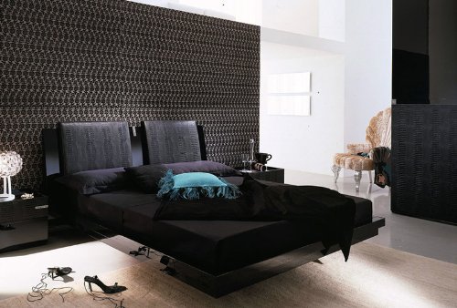 Diamond Queen Bed in Black Lacquer Finish Center supporting base giving the illusion of a floating bed High Gloss lacquered Made from wood Assembly required Does not include Leather Upholstered Panels in Crocodile Dimensions 88 x 72 x 93 inches