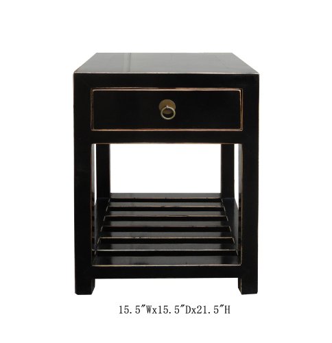 This is a black lacquered square nightstand end table which is made of solid elm wood.